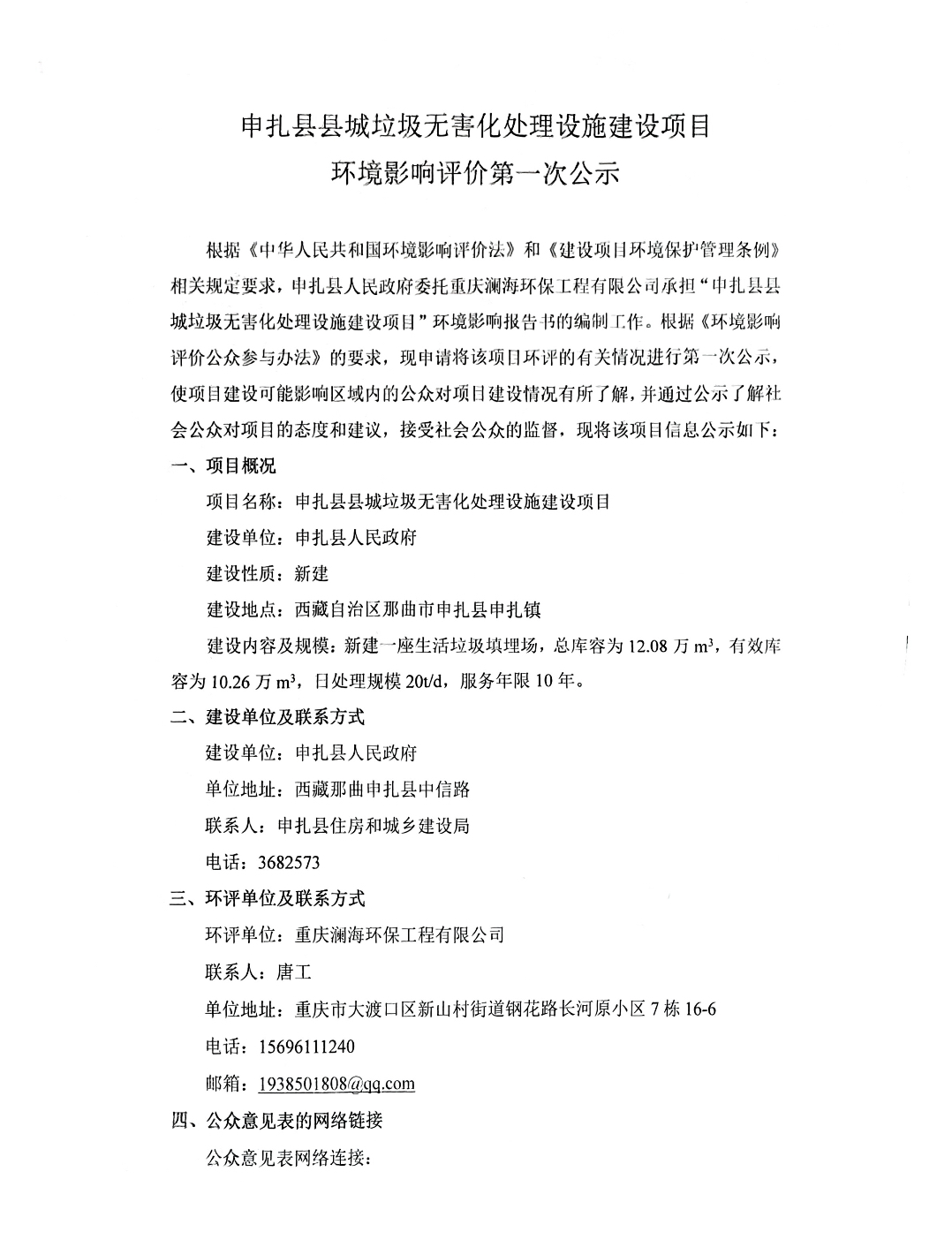 申扎县县城垃圾无害化处理设施建设项目环境影响评价第一次公示