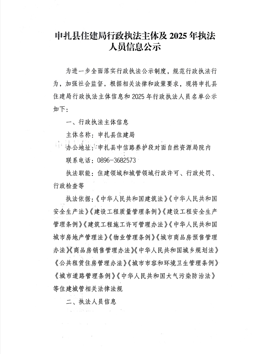 申扎县住房和城乡建设局(城市管理局)行政执法主体及2025年执法人员信息公示