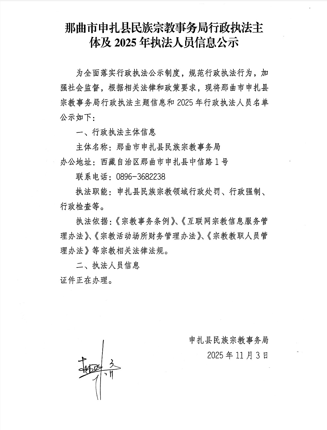 那曲市申扎县民族宗教事务局行政执法主体及2025年执法人员信息公示